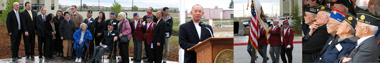 Placer County Supervisor Holmes - - Assistant District Attorney Owens - - Stuart Kageta Benediction by Rev. Tesshi Aoyama, Placer Buddhist Church Shown from left are Placer County Board of Supervisors members Jim Holmes, Kirk Uhler, Robert Weygandt, Jennifer Montgomery, and Board Chairman F. C. “Rocky” Rockholm, and 442nd veterans Frank Kageta, Shig Yokote, Al Nitta (seated), Norman Kamada; all from Placer County. To their right are two 442nd veterans from Sacramento who served also as part of the Nisei color guard at the dedication of the Placer County Memorial to the 442nd on December 16, 2009. Placer County Board of Supervisors honor family members and 442nd veterans. |